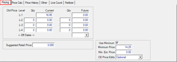 Min. Ext. Price- Primarily used for Non-Inventory items as a way to set a minimum extended price for the item. For example, set a L1 Current price of $10 an acre on fertilizer spreading services then set the minimum extended price at $100, the minimum price for any order would be $100.