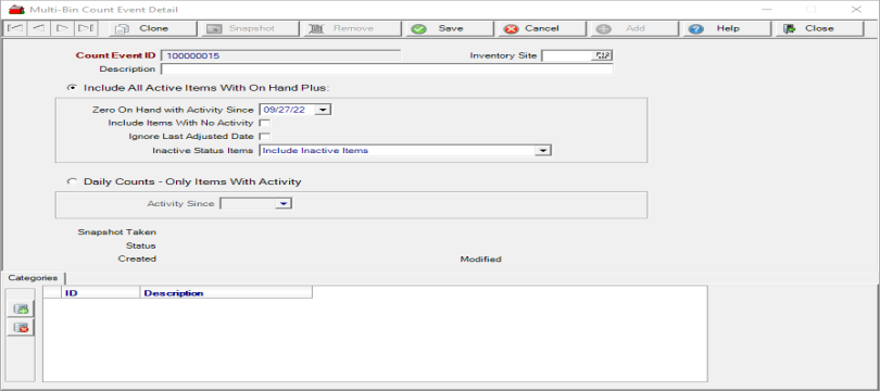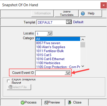 Use at the top of the window to take an inventory Snapshot Of On Hand of the Item Categories listed by selecting the Event ID in the new Count Event ID field and click Process.