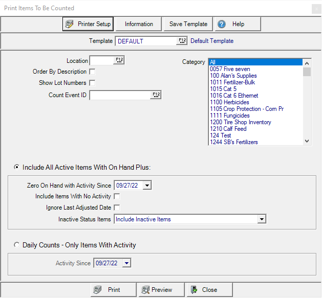 In Zero On Hand with No Activity Since use the MM/DD/YY date format or the available drop down calendar. Only items with zero quantity on hand and no activity on or since the date entered will be included on the count sheets. This field will automatically populate if included on a selected Count Event ID.