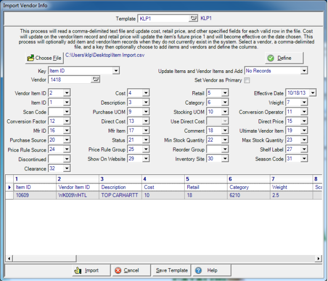 Select Import Vendor Info to update existing items or create new items using a csv, comma delimited text, file. Fields that will update on existing items include item cost, retail price if the Vendor is marked as primary, plus any additional fields included in the file. If an item is included in the file but not found, a new item will be created.