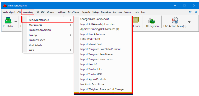 Use the Item Maintenance Menu for all functions related to mass updates of items at once such as changing costs, updating scan codes,or inactivating dead items. Select the menu title to learn more about each option available.