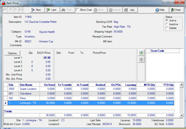 In the Site grid, click on a specific Site and in the footer of the Item Price window, view additional information about selected site.