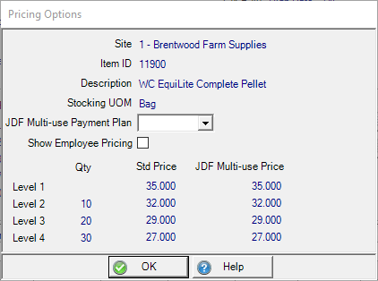 Select a Site ID in the Sites grid then click to view additional item price information for the site and select a JDF Mutli-use Payment Plan to view the total price of the item if settled to the selected credit plan.