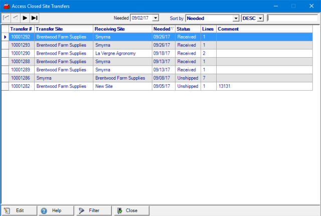 Use Needed to filter the grid and view only Transfers set to a specific Needed date. Enter the date using the mm/dd/yy date format or select using the drop down calendar.