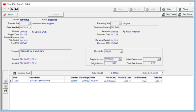 View Site Transfers that have been received or canceled listed in Closed Site Transfers.