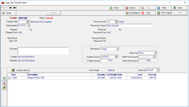 Freight Amount- Enter an amount of freight associated with the transfer.