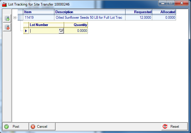 Select the Add icon and enter the Lot Number or select F12 to search. Enter the quantity of the Item shipped from all applicable Lots. Select Post to assign the Lot numbers to Items.