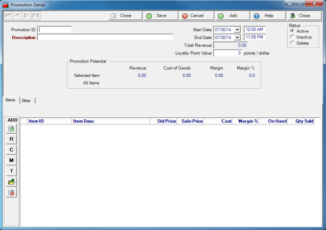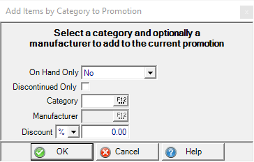 - Category - Add a category of items. When adding a category of items, specify the category and the amount of discount to be applied to the L1 Current Price. Use the drop down to specify if the discounted price should apply to Any Site, Promotion Sites or No to allow the promotional price to be used for On Hand Quantity and Discontinued items only. Once items have been added to the Item grid, they can be edited or deleted.