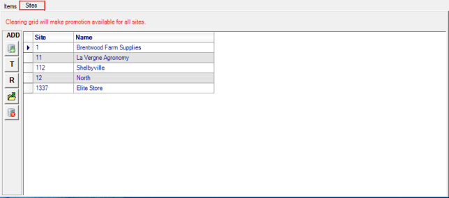 Select an individual Site by entering the Site number of select F12 to search. If left blank, the promotion will run at all Sites.