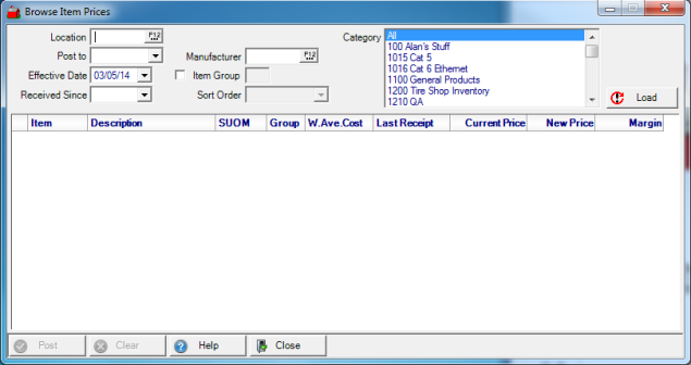Browse Item prices provides a method of updating one, multiple or all item prices manually for a selected Item Category. Enter a new Price or Margin to calculate the New Price. Enter a new price to view the updated margin on the item before price changes are posted.