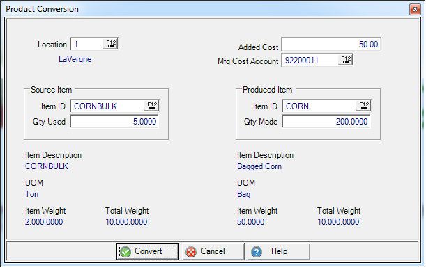 Use Product Conversion to convert a one ingredient item from one form to another such as using a quantity of bulk corn to create bagged corn. If multiple ingredients are needed, use Assembly Orders not Product Conversion.