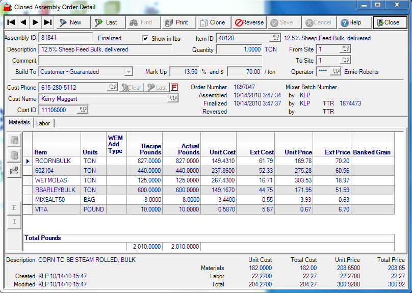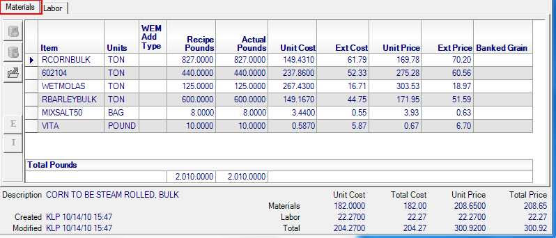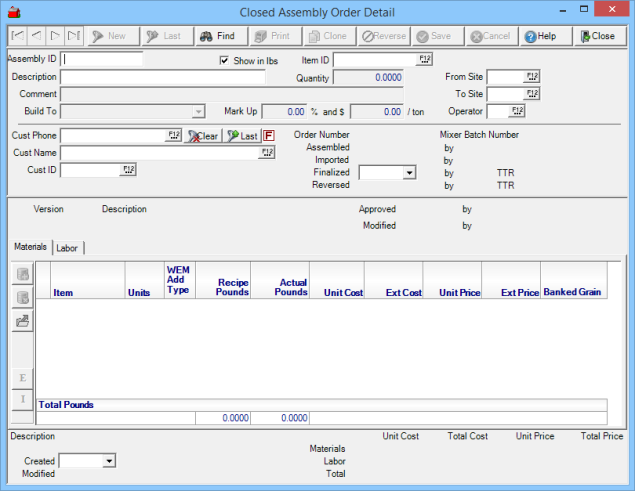 Recipe Pounds- Total pounds of the item expected to be used in the Assembly Order. This is calculated by multiplying the Lbs/Ton indicated in the Item selected in the AO header by the Quantity.