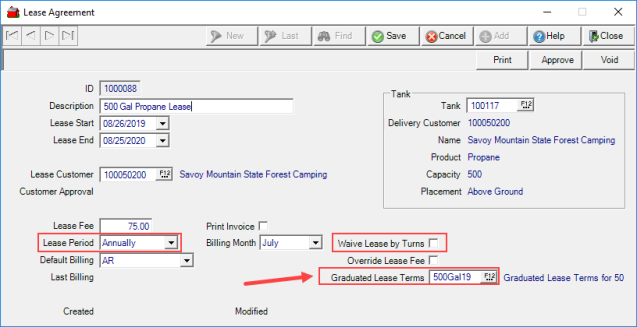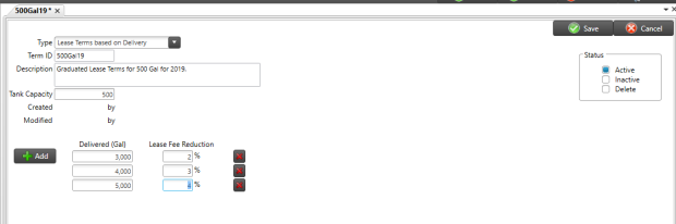 Enter a Tank Capacity as a reference to what Tank Capacity the Graduated Lease Term may be applied. Entering a capacity does not restrict selecting the Graduated Lease Term to lease for that tank size only.