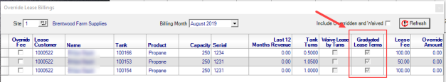 If using Override Lease Billings, an Override Amount can be set for any tank flagged with Graduated Lease Terms and the tank Lease Fee will be updated appropriately.