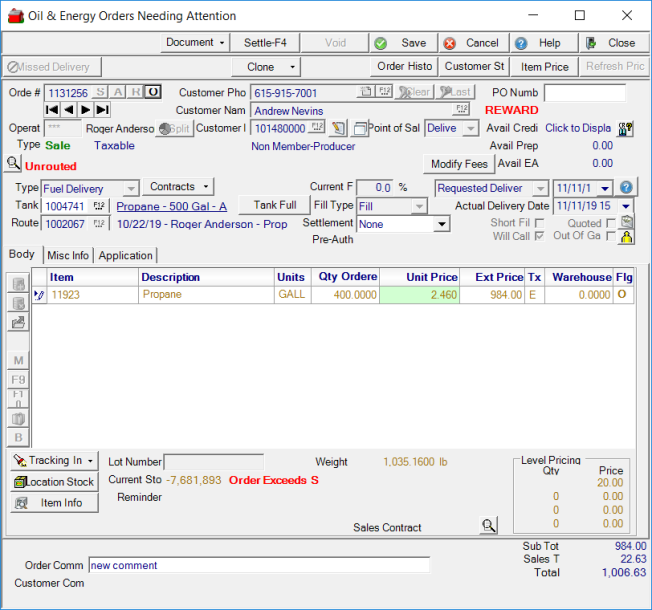 Grant permission to User Profiles in Access User Profiles > select a User Profile > Menu Security > Oil & Energy > Main Menu > Access Orders Needing Attention. |