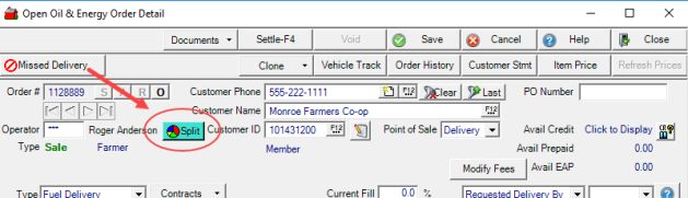 If no default Split is indicated on the tank, an existing customer Split can be applied or a new Split created at the time of settling an Oil &Energy Order by selecting the Split button.