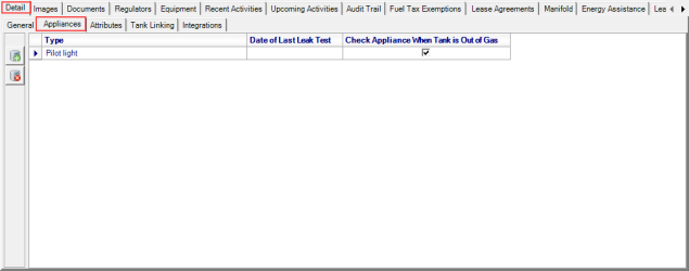 Use the Appliance tab to record details specific to the Tank such as a pilot light.