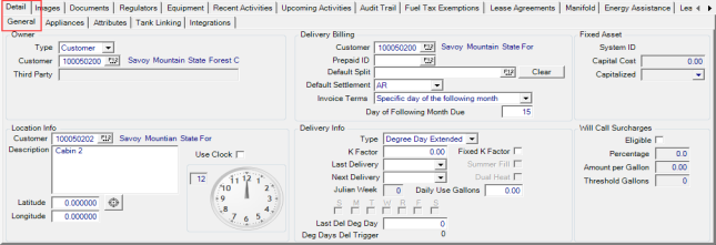 Use the Detail tab on a Tank to specify the Owner, Location and Delivery Billing and Delivery Type.