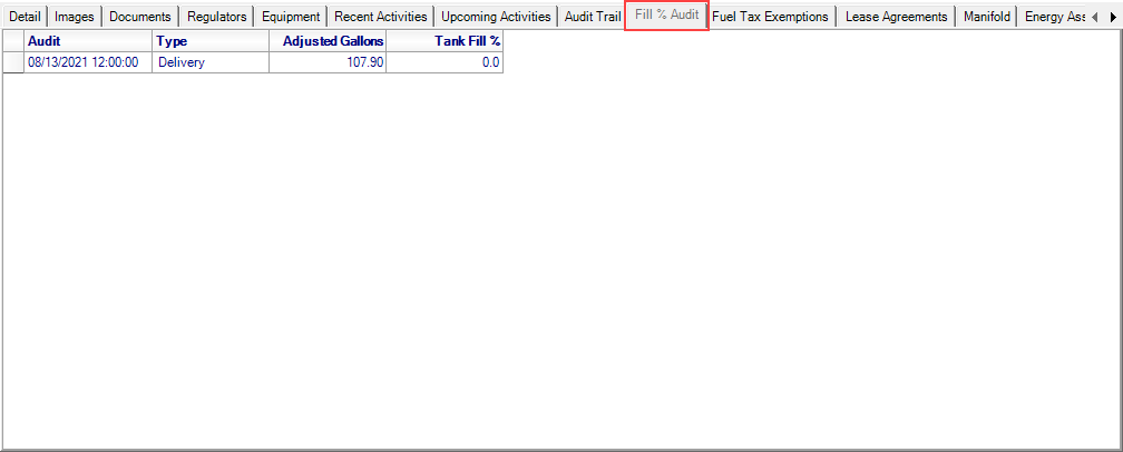 Use the Fill % Audit tab to track the events that affect the Current % on tanks and indicate if the Current % was adjusted by a finalized order or the SRV task, Update Tank Percent. The Current % field found in the Tanks header is updated when orders are finalized and when the Update Tank Percent SRV task runs based on the tanks' Daily Use Gallons. If orders are finalized after the delivery date, the percentage was not being updated because the date from the Update Tank Percent SRV task was more recent. This caused inaccurate information in Current % on the tank causing the needed gallons on orders to be inaccurate.