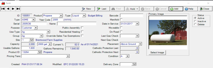 Primary Image displays the Primary Image associated with the Tank. Use the Select Image button to add or update an Image. See Access Tanks Images for more information.