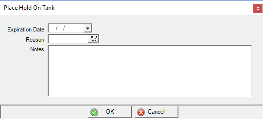 After selecting Hold, in the Place Hold On Tank window, enter an Expiration Date for the Hold using the available drop down calendar or enter using the mm/dd/yyyy date format. Enter a Reason Code ID or select F12 to search and add any optional Notes and click OK. Save all change to the Tank.