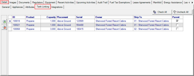 In Access Tanks. access the Tank Linking tab and use to select the tanks to link and designate one or all tanks as a Parent.