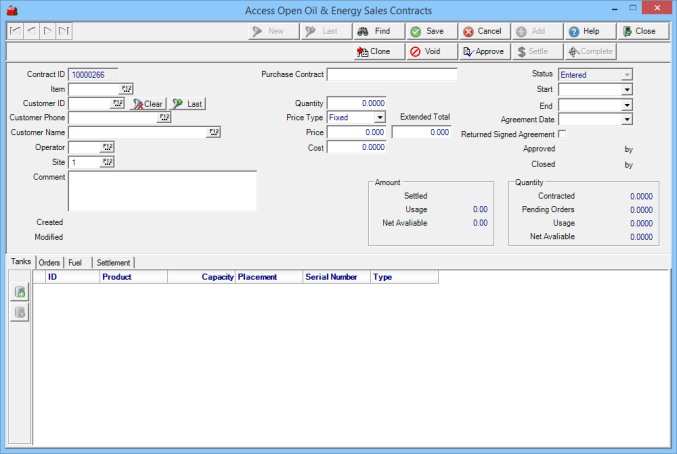 Create a new Sales Contract for an Oil & Energy Item by clicking Add and specify the Customer, Item, Quantity, Price or Cost. Sales Contracts are automatically applied when a Customer, Item and associated Tank are added to a new order.
