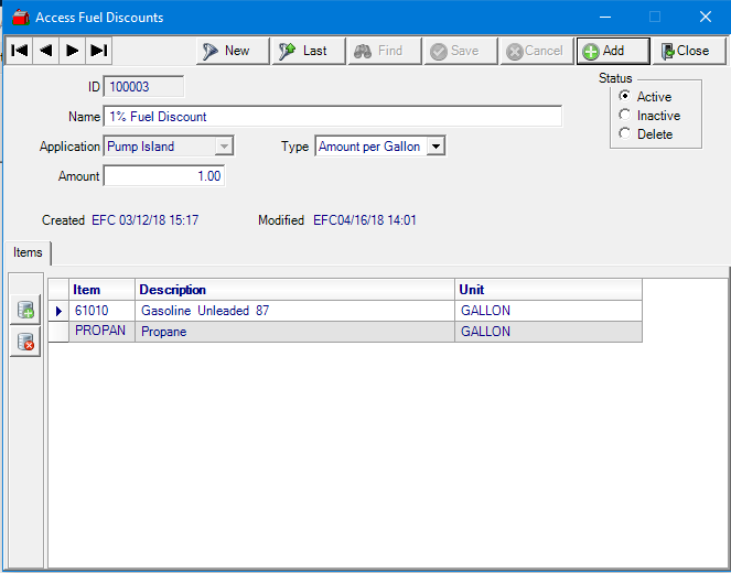 Create a Fuel Discount for Pump Island or Fuel Delivery by clicking Add and supplying the following details.