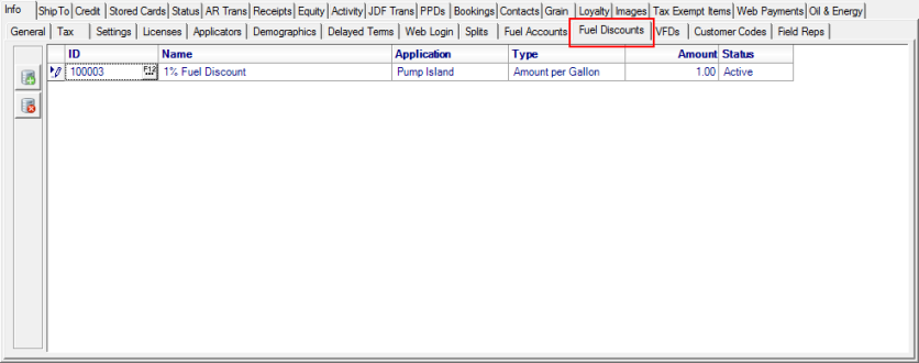 Apply a Pump Island Fuel Discount to a Customer account by navigating to the Customer account > Info > General > Fuel Discounts.