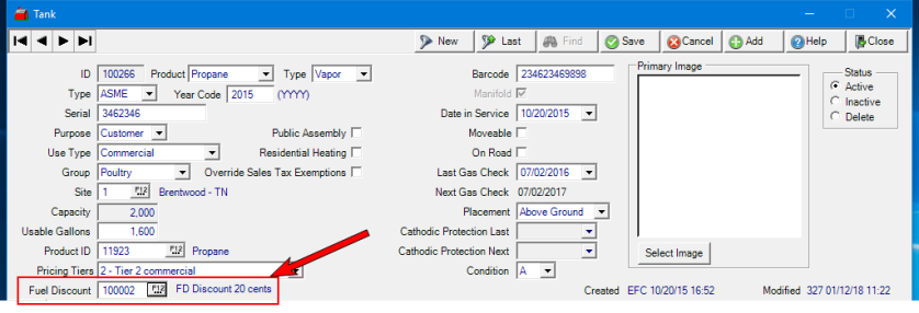 Selecting a Fuel Discount on a Tank will transfer the discount to the customer account. This process also occurs when selecting a Fuel Discount in a customer account, the Tank Fuel Discount field is populated.