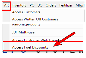 Select the menu option Access Fuel Discounts found on the AR menu to create the Pump Island and Fuel Delivery Discounts to be applied to Customer accounts and Access Tanks.