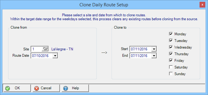 Click OK to clone the selected Routes. See also Clone Daily Route Setup.