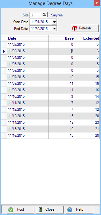 Refresh- Select to populate the grid with all dates with degree day information entered.