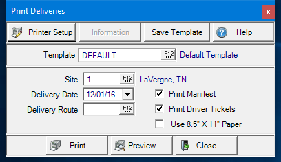 Use Print Deliveries to generate the Manifest and Driver Tickets for deliveries.