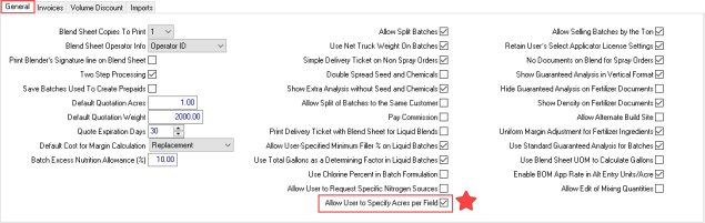 Select Allow User to Specify Acres per Field found in Merchant Ag FIN > Admin > Installation > Access Parameters > Fertilizer > General to activate the new tab found on Orders and Batches, Application. This allows Fields, Vehicles and Applicators to be selected as needed on Orders and Batches.