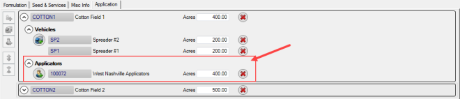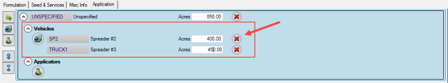One or more applicators can be selected for Orders and Batches with the number of acres they are responsible for indicated in the Acres field. If needed, remove a vehicle by clicking the red "x". There is no validation to the total acreage of the field.