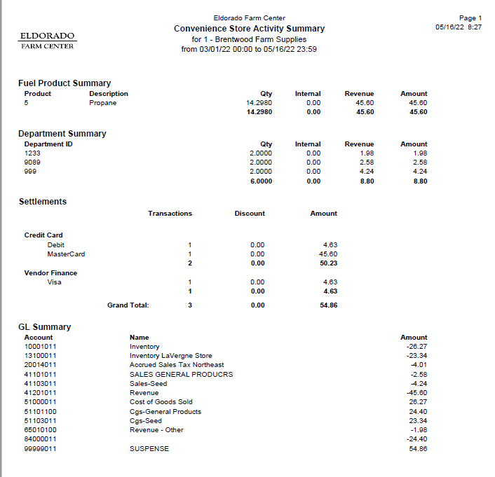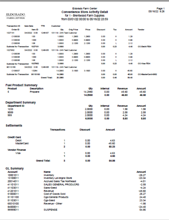 The Settlements section totals transactions by tender type. Amounts settled to multiple tenders on one transaction will be included in the correct tender type total.