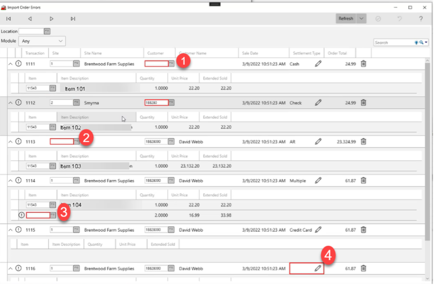 When the Module is set to Any, all orders that failed to process will populate the grid or use the drop down list to focus on a specific Order type.
