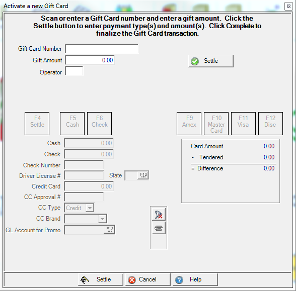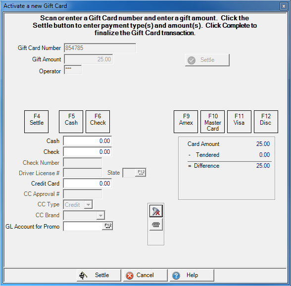 In the Settle portion of the screen, all settlement methods available to the customer account will be active. When all tender methods total the Gift Card amount, select the Settle button at the bottom of the screen to complete the gift card activation and payment.