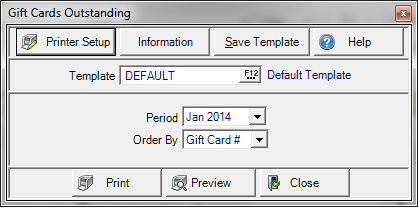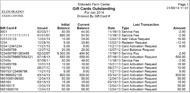 The Gift Cards Outstanding report provides transaction, current and initial balance information for the current or previous period for active Gift Cards.