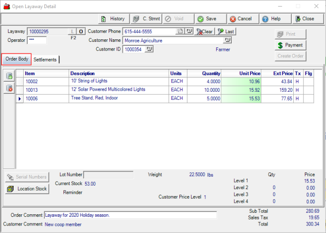 Use Access Open Layaways on the Orders menu to create a new layaway or accept payment for an existing Layaway. Layaways provide a method for customers to incrementally pay for items and accept delivery when paid in full. From the Open Layaway Detail window, select the "O" for all current Open Layaways. See Select Open Layaway for more information.
