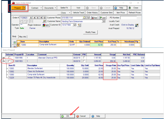 Use the plus sign to the left of the Selected column to expand and review the Items and usage rates on the Prepaid. Click the checkbox in Selected to apply the Prepaid to the Order or Batch.