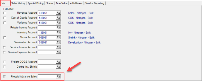 To track Prepaid transactions with a specific General Ledger account when the parameter Prepaid GL at Category level has been selected, use the Prepaid Advance Sales field to select a full GL account found in Setup > Item Category > GL.