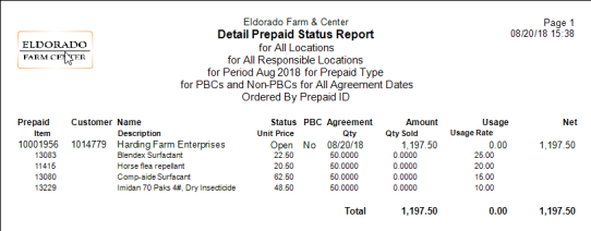 Choose the Report Type Detail to view a list of all Items and their usage rates entered on a Prepaid. Creating a Summary report provides the Prepaid ID, Customer and total amount of the Prepaid.