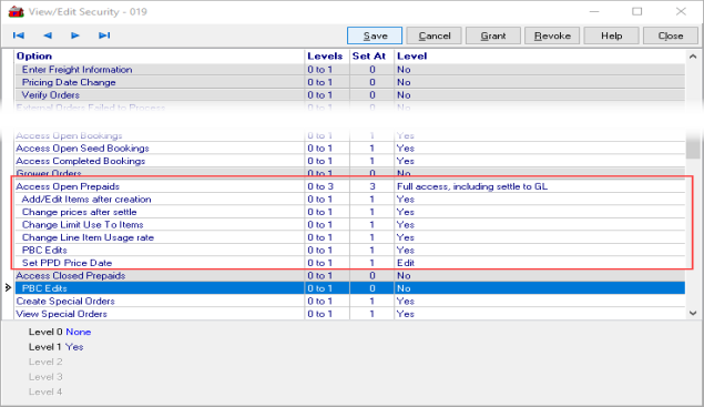 Grant security to users to the new options within Prepaids and to create new Prepaid types. Navigate to Merchant Ag FIN > Admin > System Security > Access User Profiles > select a Profile > Security > Orders module > Menu Security. In the Access Open Prepaids section, choose the options the user should have access to and select Save.
