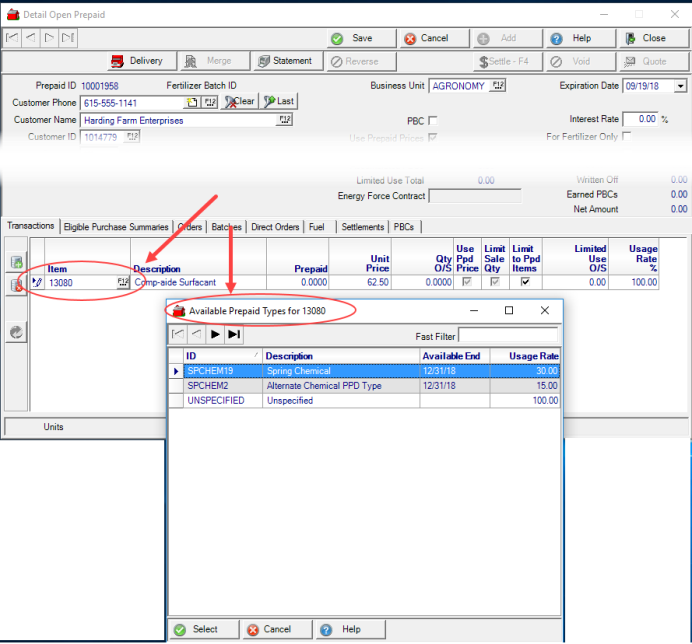 The Available Prepaid Types listed include only those that include the Item entered and the default Unspecified Prepaid Type. Double click the preferred Prepaid Type or click once and the Select button.