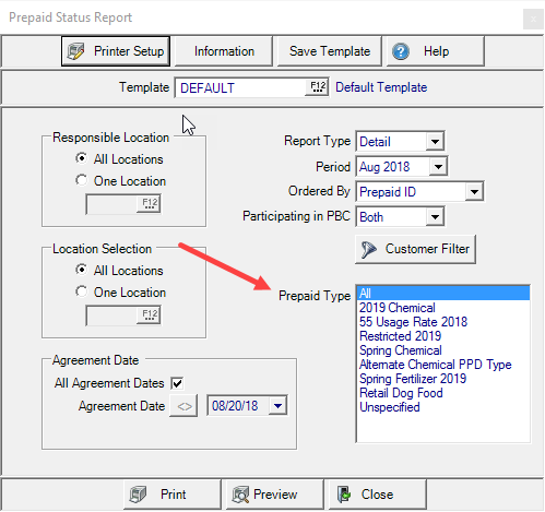 Create a Prepaid Status report and choose to view the details of the line items included on a Prepaid by selecting one, multiple or All Prepaid Types.