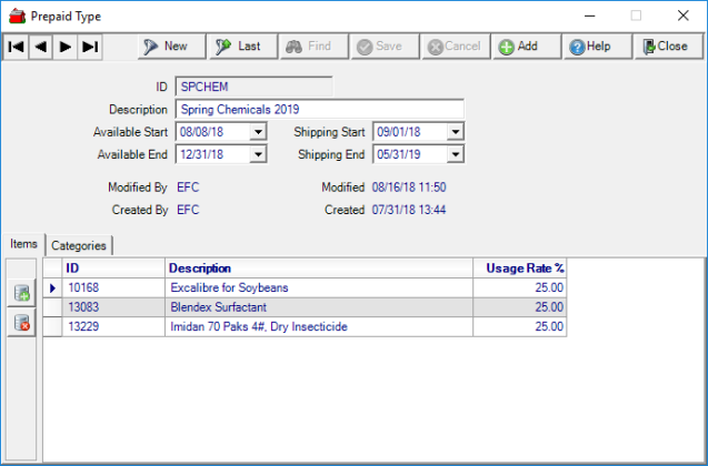 The ability to create and apply individual usage rates to items on a Prepaid is now available in Merchant Ag. This new functionality allows a Prepaid Type, also known as Program, to be created, items added and usage rates to be assigned. Add a General Ledger account at the Item Category level for visibility on Prepaid transactions. To utilize this new functionality, several components will need to be selected in Merchant Ag FIN and created in Merchant Ag PM. Access to the new functionality will be granted in Access User Profiles.