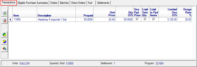 Limit the Prepaid to selected Items listed on the Transactions grid. Items can be listed individually on the Transaction tab and be included in any Purchase Summary added to the Prepaid. As transactions are settled, the Item will be available for the quantity and price listed on the transaction tab first, then will use any available Prepaid amount allocated to the Purchase Summary found on the Eligible Purchase Summary tab.