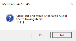 Close out the selected item and move to AR by clicking . The dialog box as seen below will confirm the amount to move to AR and the Item ID. Click Yes to complete the item close out.